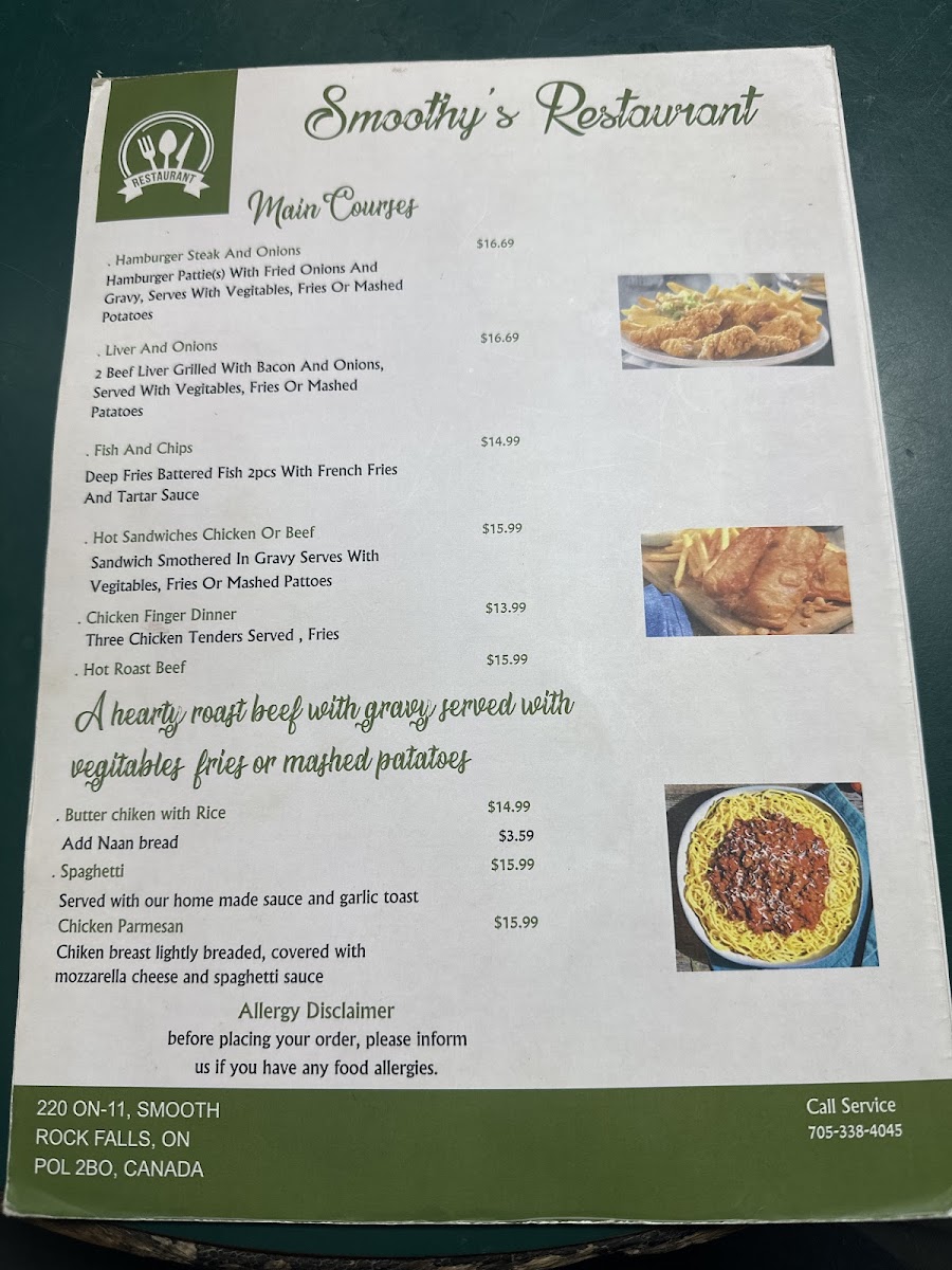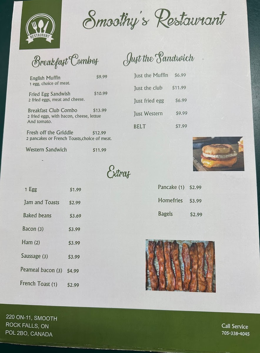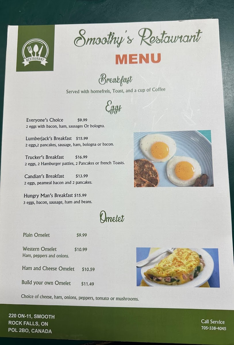 Welcome to Smoothy's Restaurant, a delightful dining gem nestled in Smooth Rock Falls, Ontario. Known for its hearty breakfasts and satisfying dinners, Smoothy's offers a menu that caters to both locals and visitors alike. Your morning can start off right with the highly praised Everyone's Choice breakfasts, featuring expertly cooked bacon and abundant coffee that will keep you energized throughout the day.